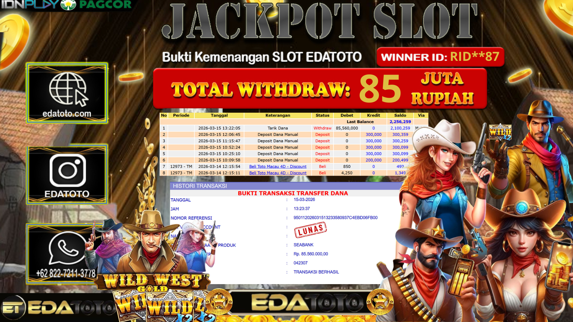 Selamat Kepada Pemilik user ID : Mo*** Hari/Tanggal : Jum’at / 13 MARET 2026 Jackpot : Rp, 21,254,820 JT Withdraw . . .