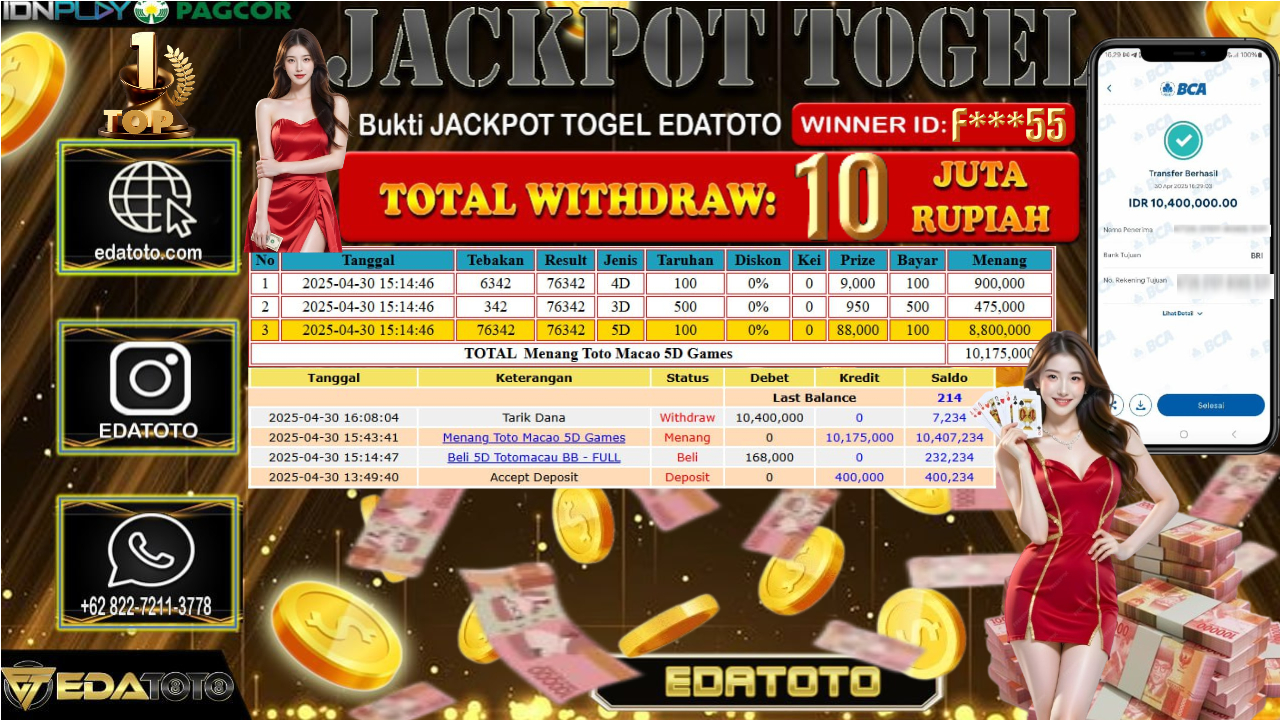 Selamat Kepada Pemilik user ID : F***55 Hari/Tanggal : KAMS/ 01 MEI 2025 Jackpot : Rp. 10.400.000 JT Permainan : TOGEL Selamat . . .