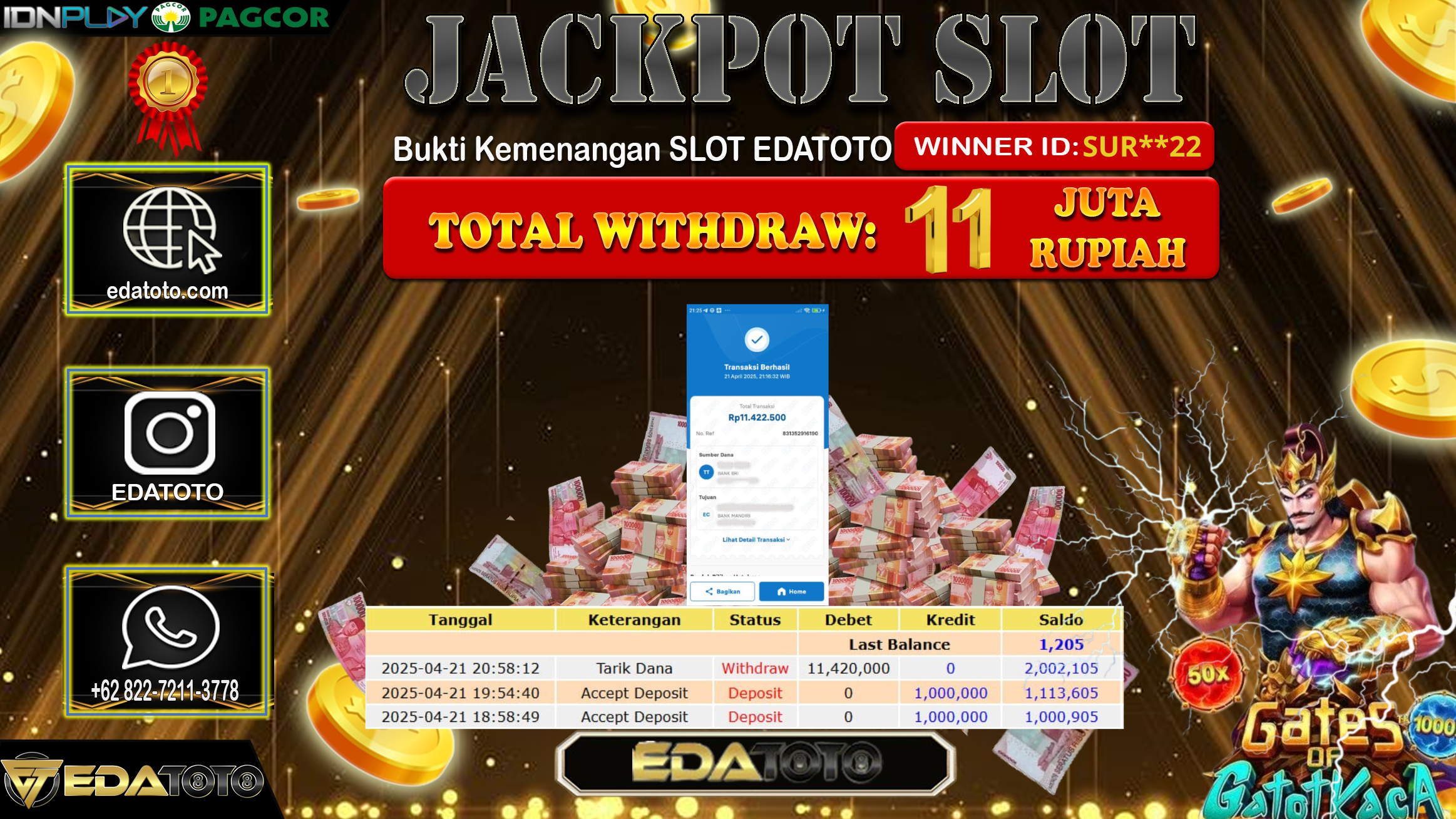 Selamat Kepada Pemilik user ID : SUR**22 Hari/Tanggal : Selasa/ 22 , April 2025 Jackpot : Rp. 11.000.000 JT Permainan . . .