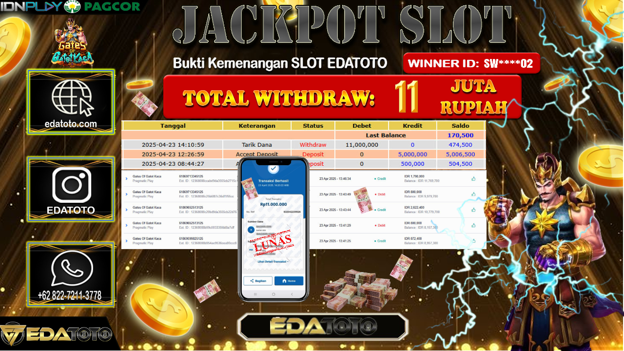 Selamat Kepada Pemilik user ID : SW****02 Hari/Tanggal : Kamis / 24 , April 2025 Jackpot : Rp. 11.000.000 JT . . .