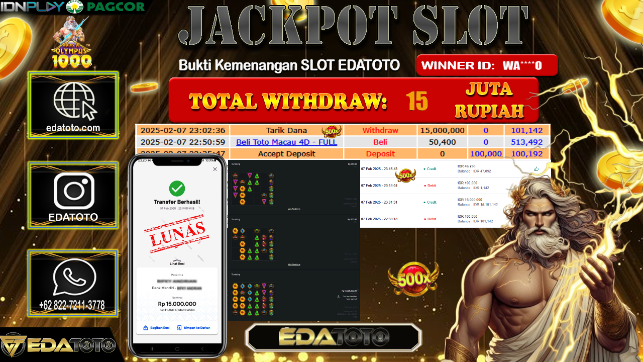 Selamat Kepada Pemilik user ID : WA****O Hari/Tanggal : Sabtu/ 08 , FEBRUARY 2025 Jackpot : Rp. 15.000.000 JT Permainan . . .