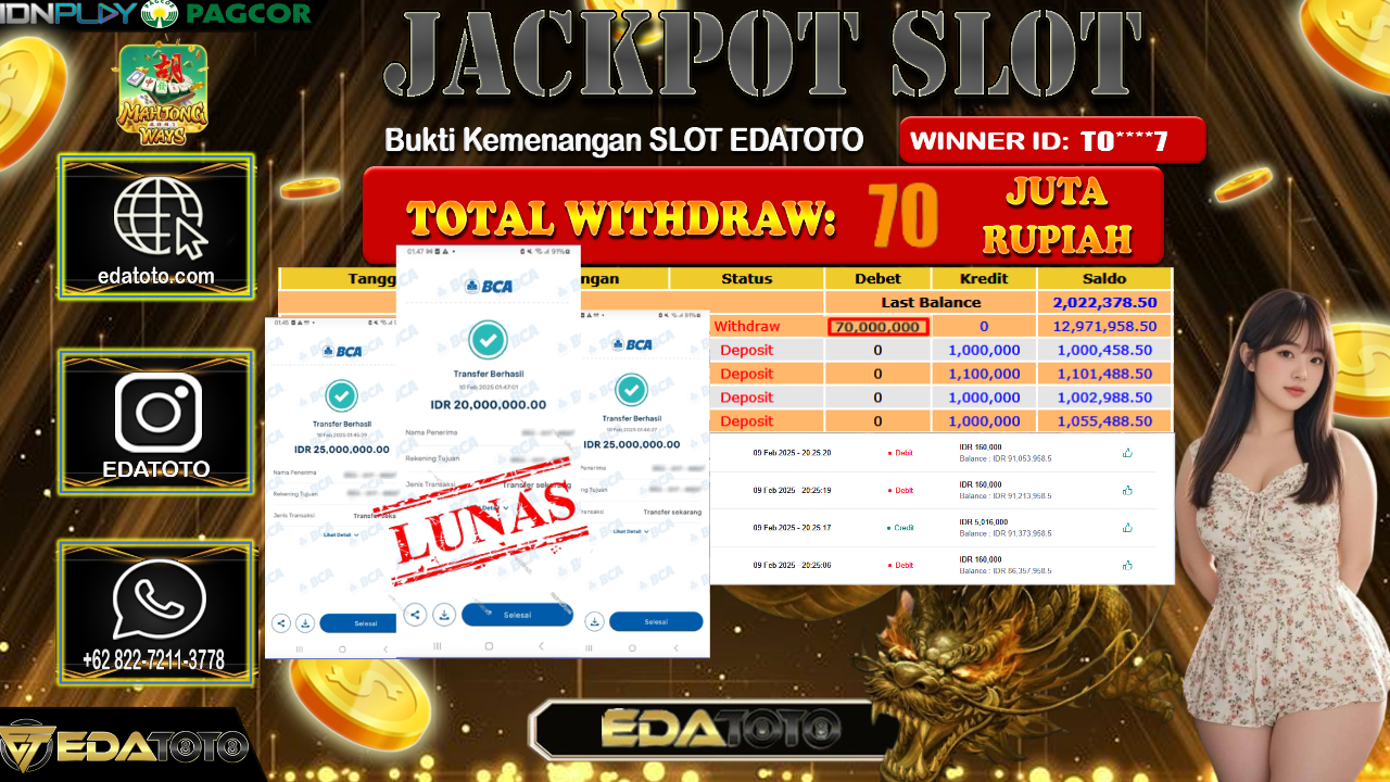 Selamat Kepada Pemilik user ID : TO****7 Hari/Tanggal : Senin / 10 , FEBRUARY 2025 Jackpot : Rp. 70.000.000 JT . . .