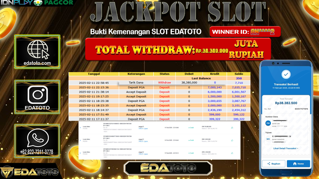 Selamat Kepada Pemilik user ID : AN****2 Hari/Tanggal : Senin / 11 , FEBRUARY 2025 Jackpot : Rp. 38.380.000 JT . . .
