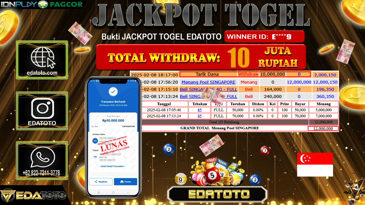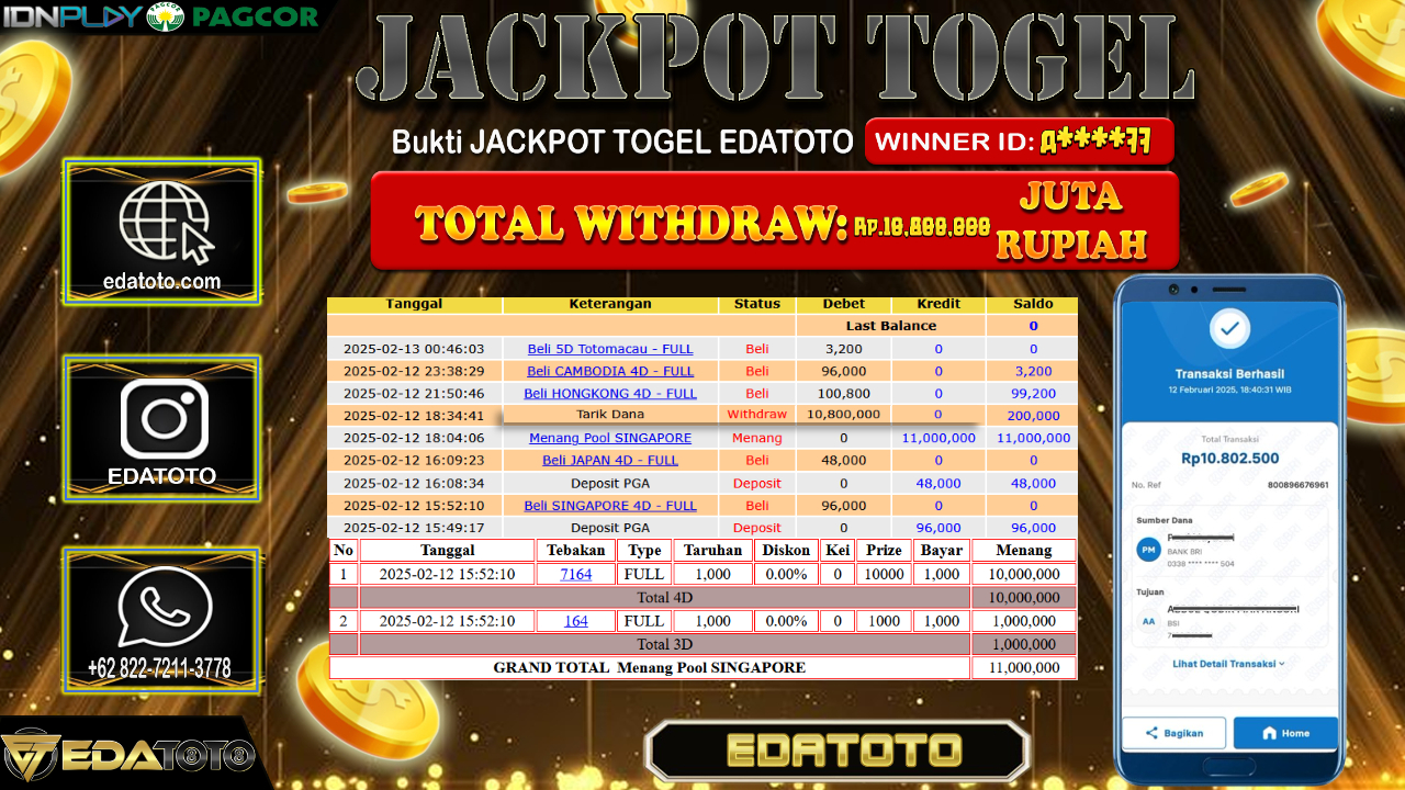 Selamat Kepada Pemilik user ID : A****77 Hari/Tanggal : Rabu / 12 , FEBRUARY 2025 Jackpot : Rp. 10.800.000 JT . . .