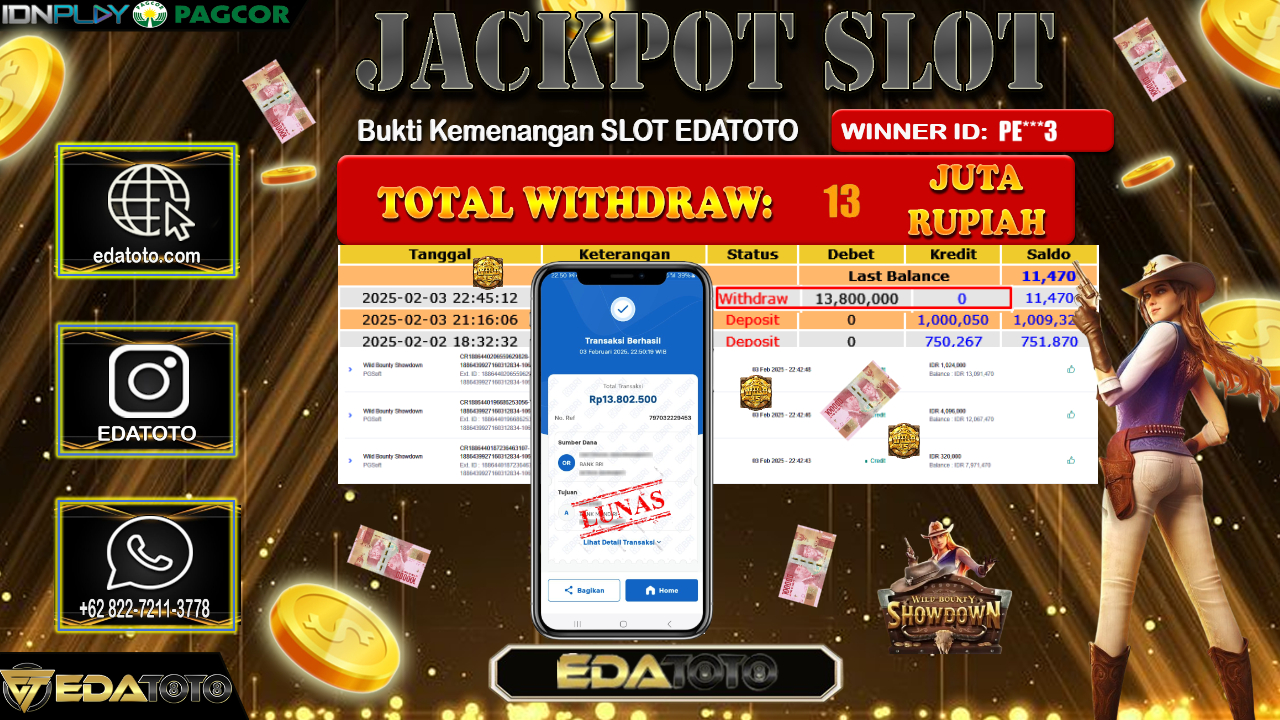 Selamat Kepada Pemilik user ID :PE***3 Hari/Tanggal : Selasa / 04 , FEBRUARY 2025 Jackpot : Rp. 13.800.000 JT Permainan . . .