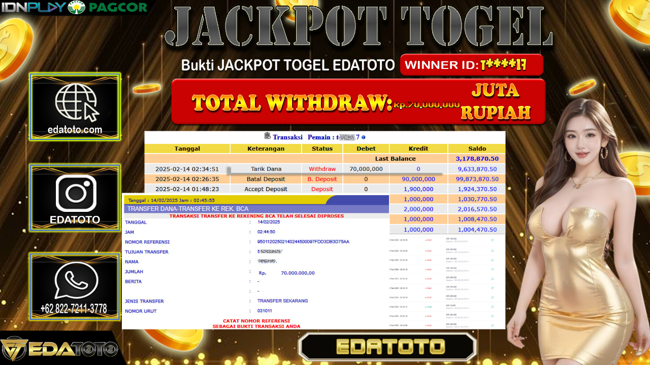 Selamat Kepada Pemilik user ID : T****17 Hari/Tanggal : Senin / 14 , FEBRUARY 2025 Jackpot : Rp. 70.000.000 JT . . .