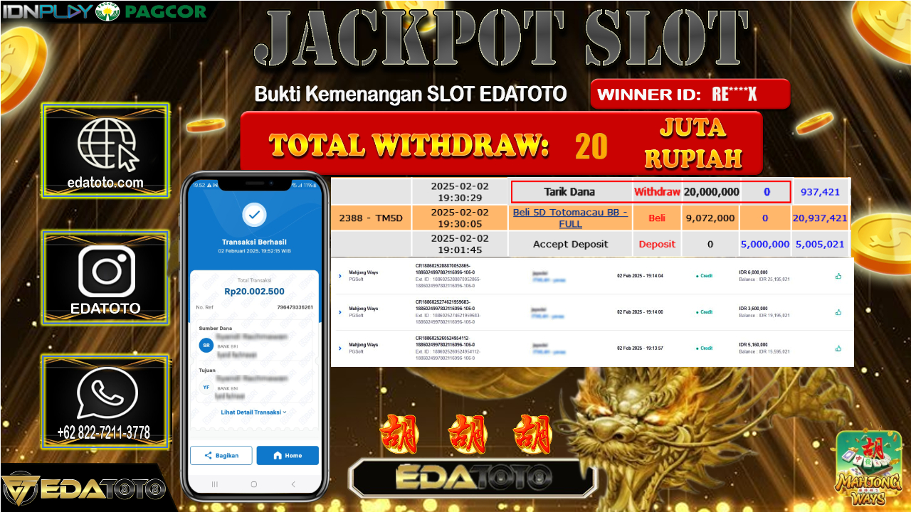 Selamat Kepada Pemilik user ID :RE****X Hari/Tanggal : Senin / 03 , FEBRUARY 2025 Jackpot : Rp. 20.000.000 JT Permainan . . .