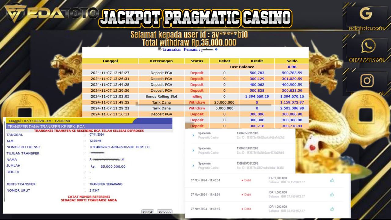 Selamat Kepada Pemilik user ID : I******** Hari/Tanggal : Jumat/ 07 NOVEMBER 2024 Jackpot : Rp. 35.000.000 JT Permainan : . . .
