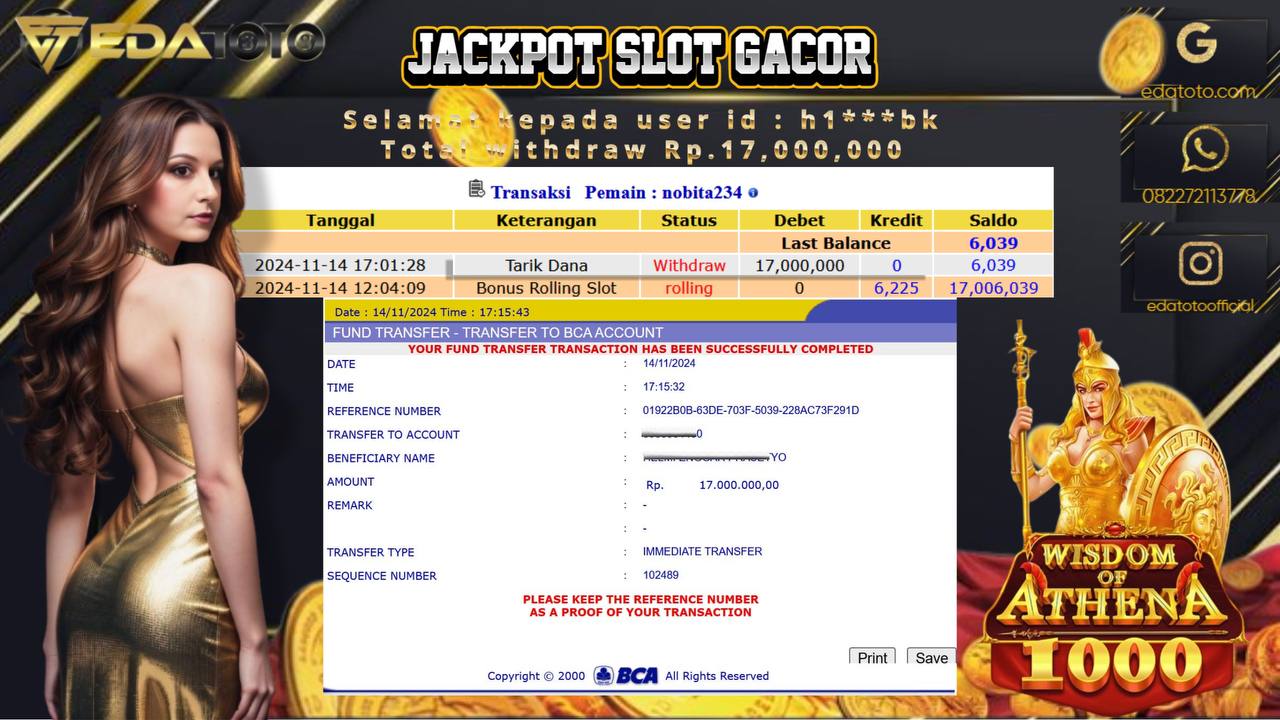 Selamat Kepada Pemilik user ID : nobita234 Hari/Tanggal : Jumat/ 14 NOVEMBER 2024 Jackpot : Rp. 17.000.000 JT Permainan : . . .