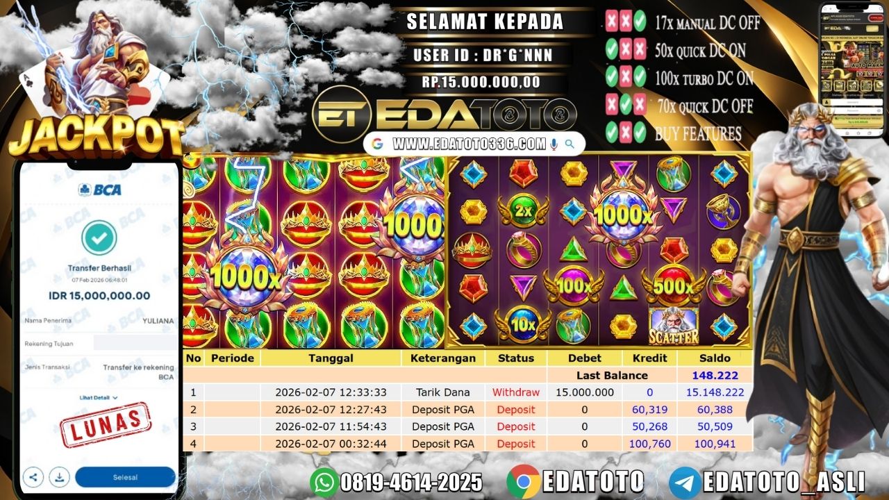 Selamat Kepada Pemilik user ID : DR*G**NN Hari/Tanggal :Jumat/ 07 februari 2026 Jackpot : Rp. 20,000,000 JT Withdraw : 15,000,000 . . .