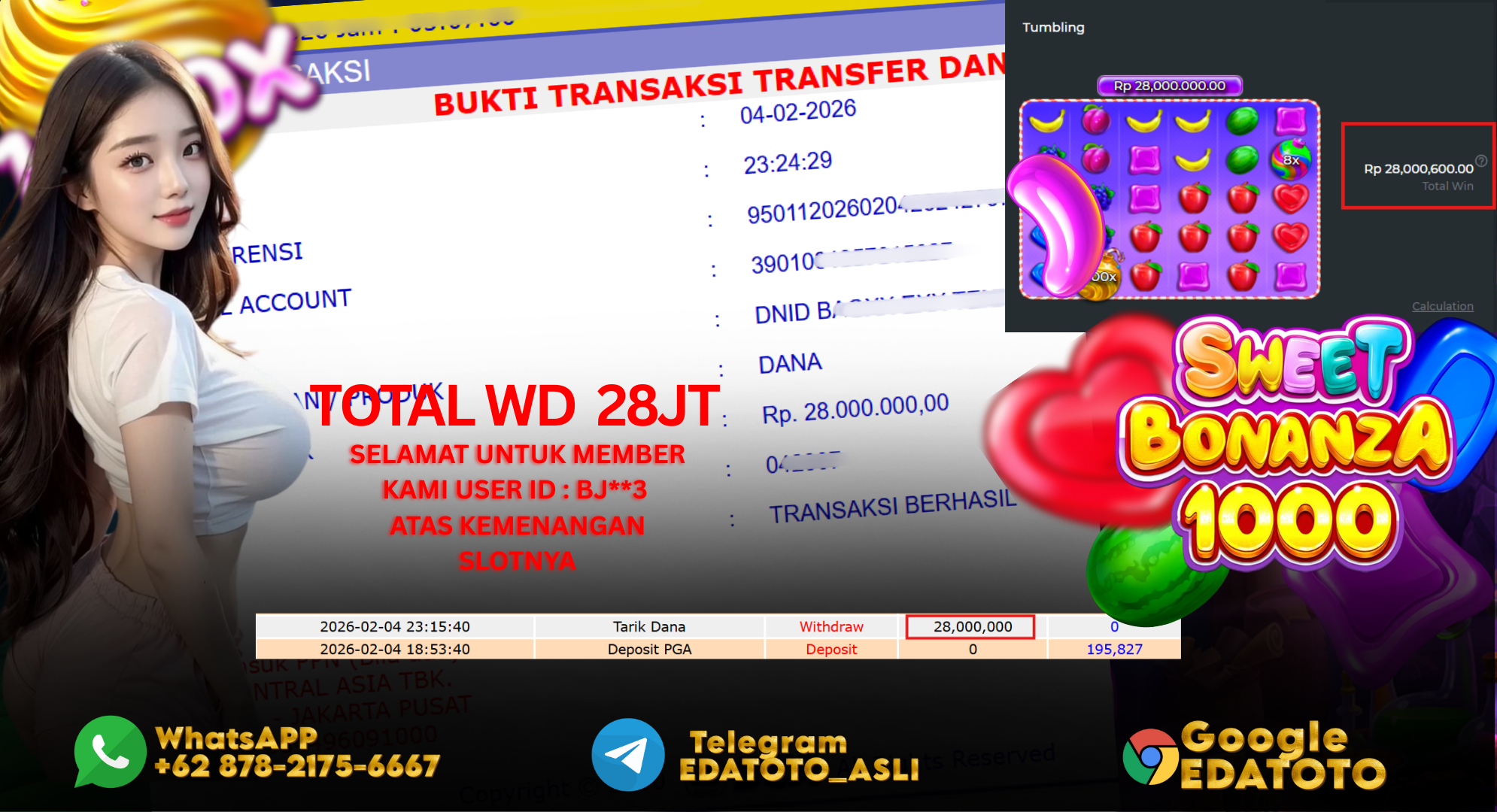 Selamat Kepada Pemilik user ID : BJ**3 Hari/Tanggal :Rabu/ 04 februari 2026 Jackpot : Rp. 28,000,000 JT Withdraw : 28,000,000 . . .