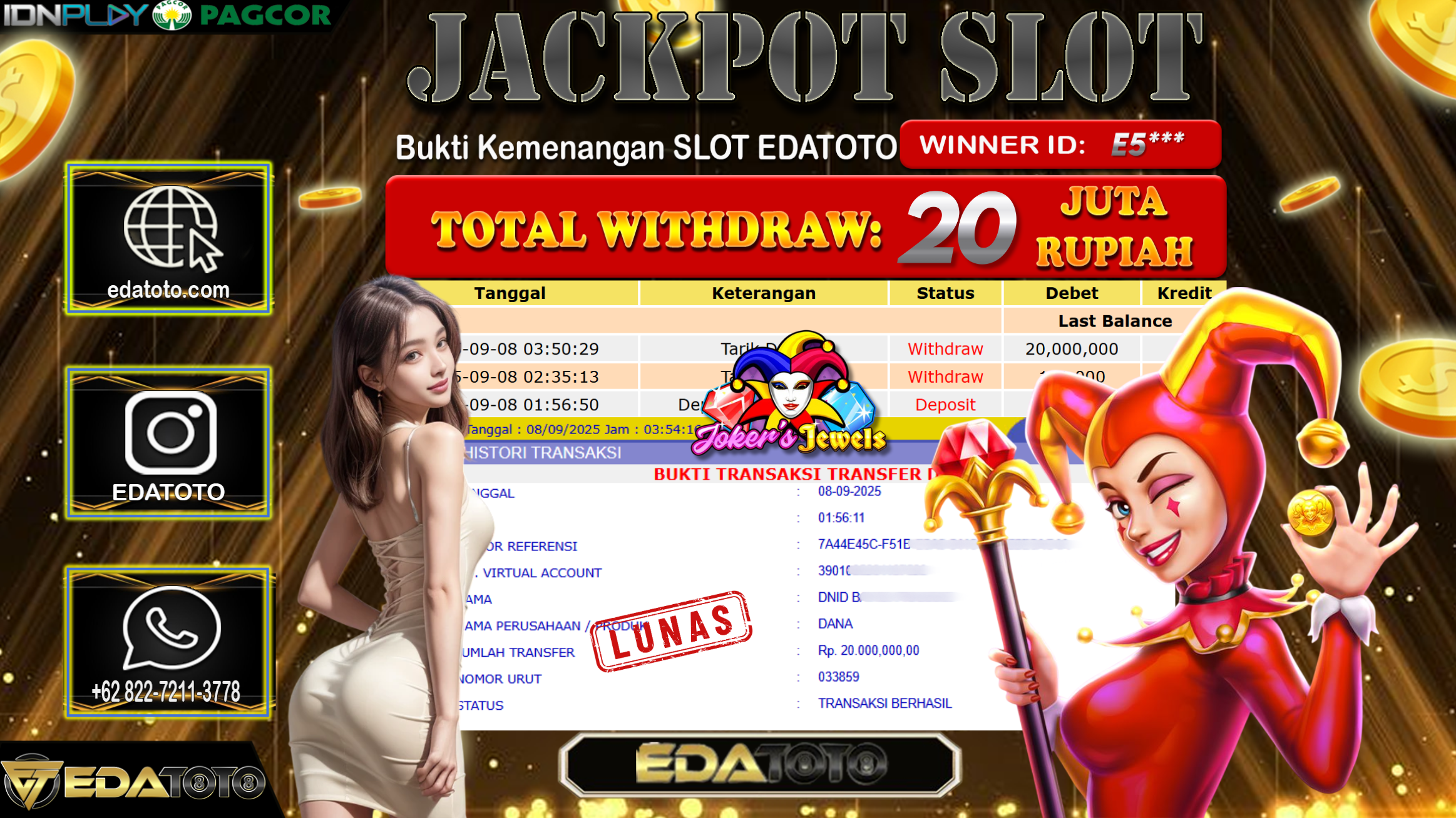 Selamat Kepada Pemilik user ID : E5*** Hari/Tanggal : Senin/ 8, September 2025 Jackpot : Rp. 20.000.000 JT Permainan : . . .