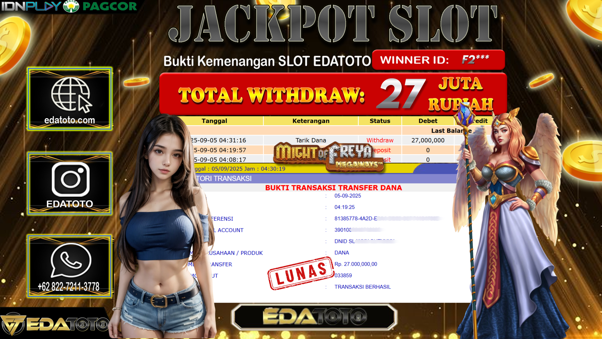 Selamat Kepada Pemilik user ID : F2*** Hari/Tanggal : Jumat/ 5, September 2025 Jackpot : Rp. 27.000.000 JT Permainan : . . .