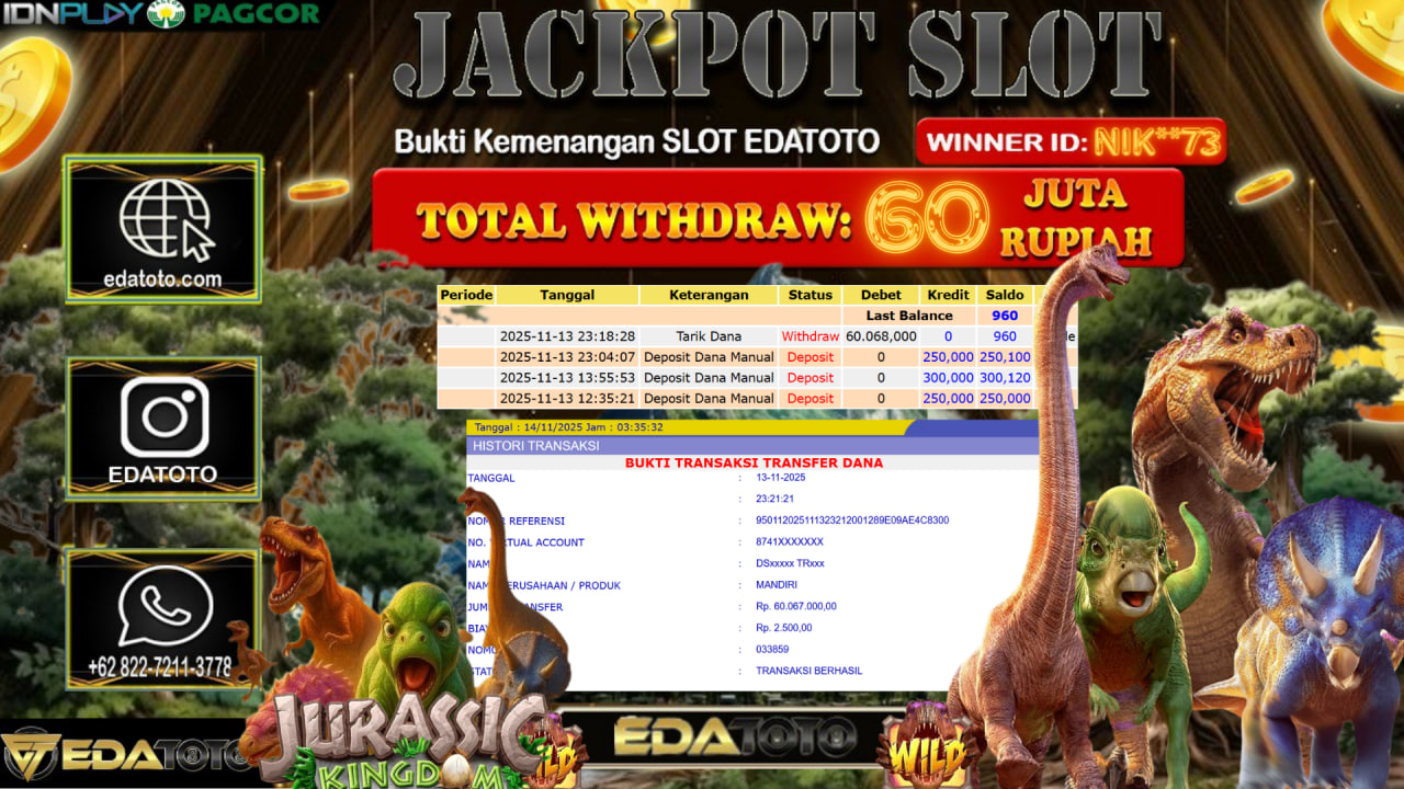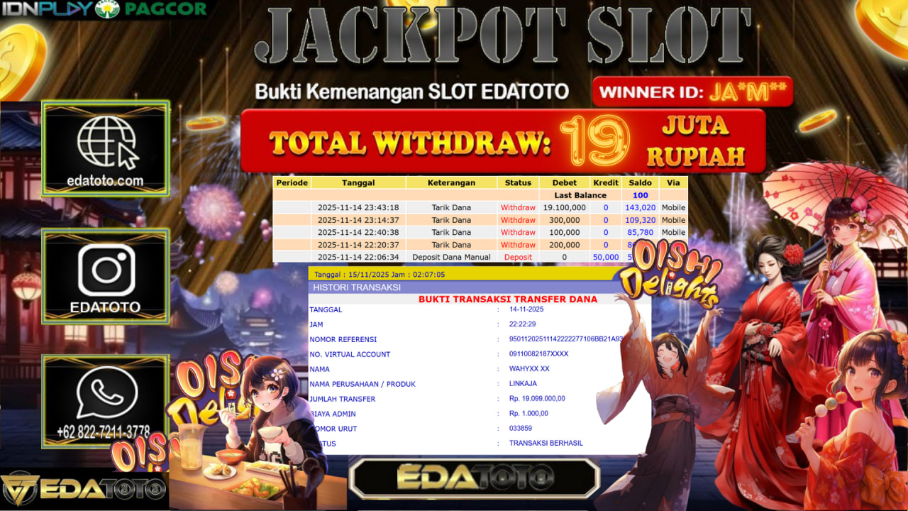 Selamat Kepada Pemilik user ID : EKO**** Hari/Tanggal : Sabtu / 15, November 2025 Jackpot : Rp. 33,120,000 JT Withdraw :23,000,000 . . .